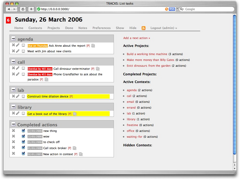 One of the holy grails of lazy "Getting Things Done" implementations is the linking between Next Actions and Projects. This fanciful idea generally starts when one either combines the phases of work, or gets really lazy about a weekly review. I found I did both, and it caused me some problems later on. One of the problems I had with my Palm setup is my combining of the Collecting and the Organizing phases (which is strictly verboten, but I still did it because it was convenient at the time). With the Palm, I'd quickly jot down an action like "Search Google for SSL information" and stuff it into my @Computer Web context. Unfortunately, by the time I actually find time to do that task, there's less chance of me remembering that it was the next action for "Set up Apache with SSL on Lister", so I'd gloss over it for something that has more meaning. This isn't usually a problem if one does the weekly review with any regularity, as old next actions can be shuffled away, and new next actions can take their place (or my internal editor can change it to read "Search Google for information on setting up SSL with Ubuntu and Apache). Unfortunately, after having lackluster weekly reviews for over six weeks, the whole damn system fell apart. I started looking at my lists with disdain, and started blaming the tools I had used for many years for not keeping me current. With Tracks, every project and next action are linked together, so I can click on the Project link from a Next Action to see what it relates to, or I can click on a Project to see what Next Actions are currently in play. That's functionality I find VERY useful, even with a stellar weekly review.
